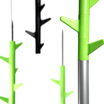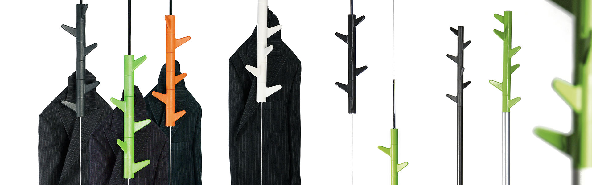barevnost háčků: antracit, bílá, oranžová, zelená a červená, v kombinaci s barvou podstavy a tyče – černá, bílá, stříbrná, cihlová (terracotta).